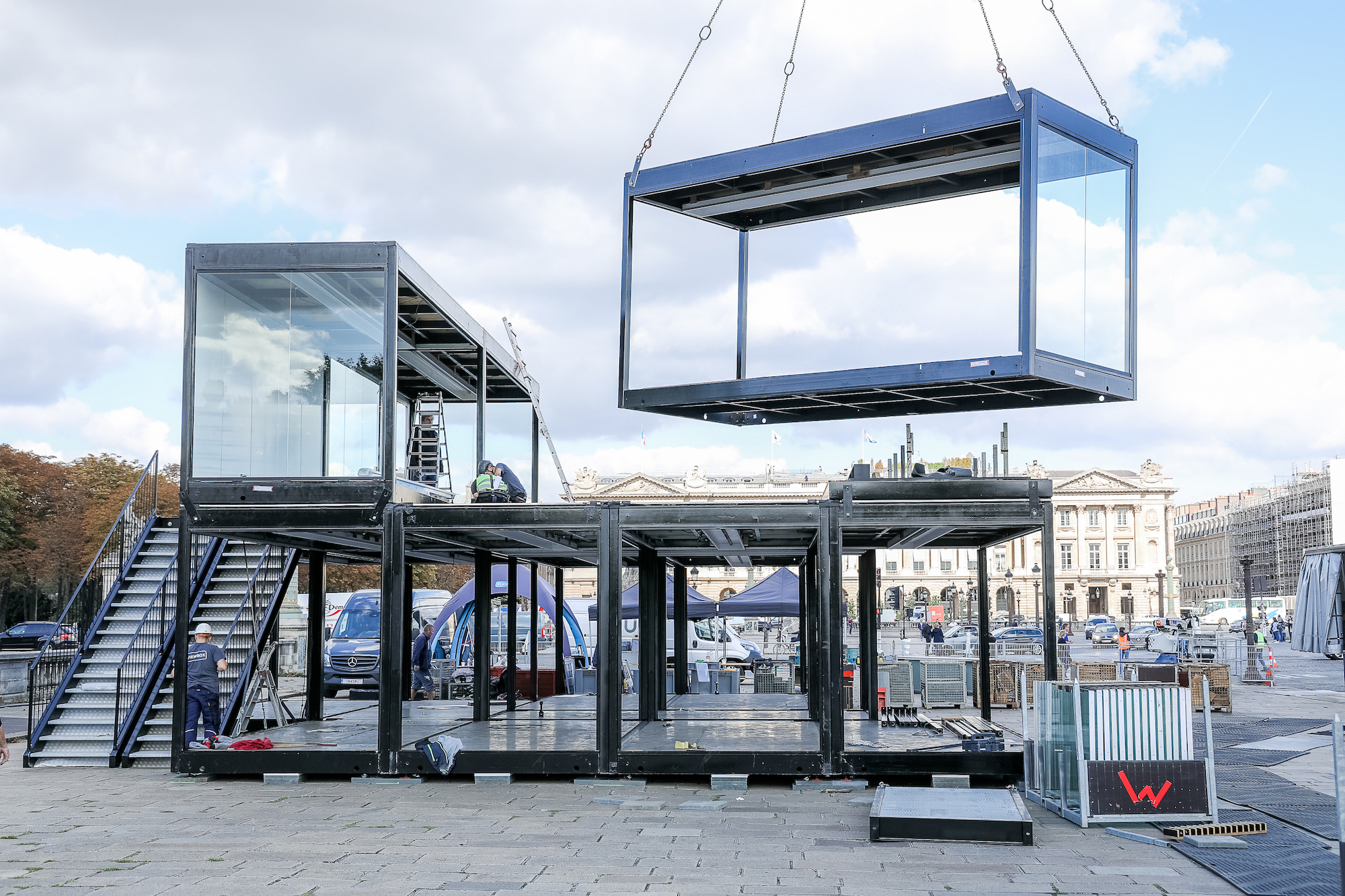 A Viewbox is transported via truck and installed using a crane.